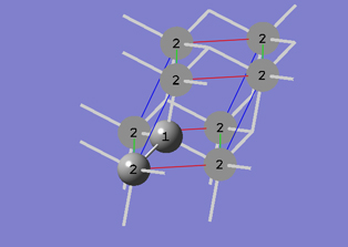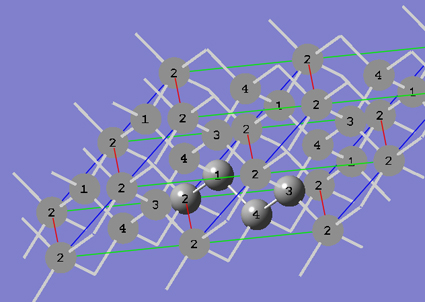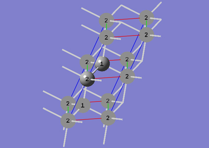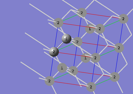 5-10 In the Cell tab of the PBC dialog, selectc (0,0,1) instead of b (0,1,0) to enable placement of the head of the "c" lattice vector at any atom selected in the view window using the mouse. In the view window, click on the atom at position (0, -1, 2).