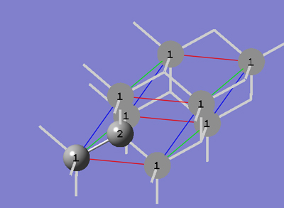 6-4 In the Cell tab of the PBC dialog, push down the Place button and selectc (0,0,1) instead of b (0,1,0) to enable placement of the head of the "c" lattice vector at any atom selected in the view window using the mouse. In the view window, click on atom 5.